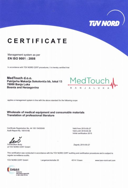 MedTouch d.o.o. je specijalizovana firma za veleprodaju medicinskih sredstava i profesionalne opreme za fizikalnu terapiju, rehabilitaciju, fitness i spa. Od 2011. godine, naše iskustvo i stručnost nas čine pouzdanim partnerom za institucije koje zahtijevaju vrhunsku opremu. Naši proizvodi su sertifikovanog evropskog porijekla, garantujući kvalitet i sigurnost. Generalni smo zastupnici i distributeri za renomirane svjetske firme kao što su Derma Art, Chinesport, Chirana Progress, Rimec, PHYSIOMED, EF Medica, Proxima, Thera-Band, MVS, Gima, Velebit, EMF Furlan&Co, Nelit M.T, Wesco, Ropimex, Enim, Novafon, Ewac i mnoge druge. Do sada smo opremili brojne ustanove, uključujući Zavod za fizikalnu medicinu i rehabilitaciju dr Miroslav Zotović, JZU Banja Ilidža Gradačac, Specijalnu bolnicu – Banja Mlječanica, Privatnu ordinaciju za fizikalnu terapiju i rehabilitaciju MHS, ZU Deamedica i mnoge druge.